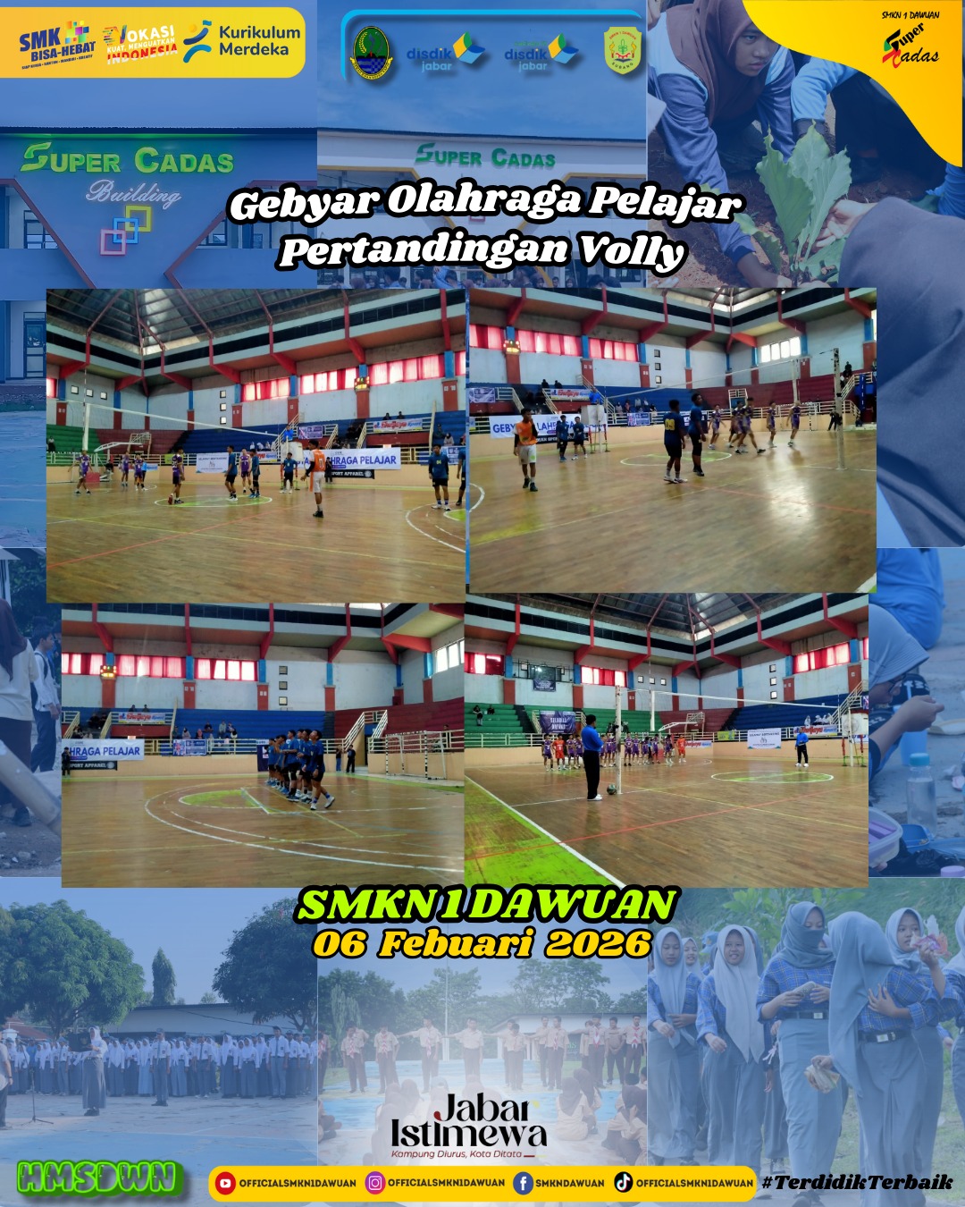 Pertandingan Volly Gebyar Olahraga Pelajar Bola Volly di GOR Gotong Royong Subang. di mna SMKN 1 Dawuan Berkontribusi mengikuti pertandingan volly di turnamen Gebyar Olahraga Pelajar yang di selengarakan oelh Universitas Subang