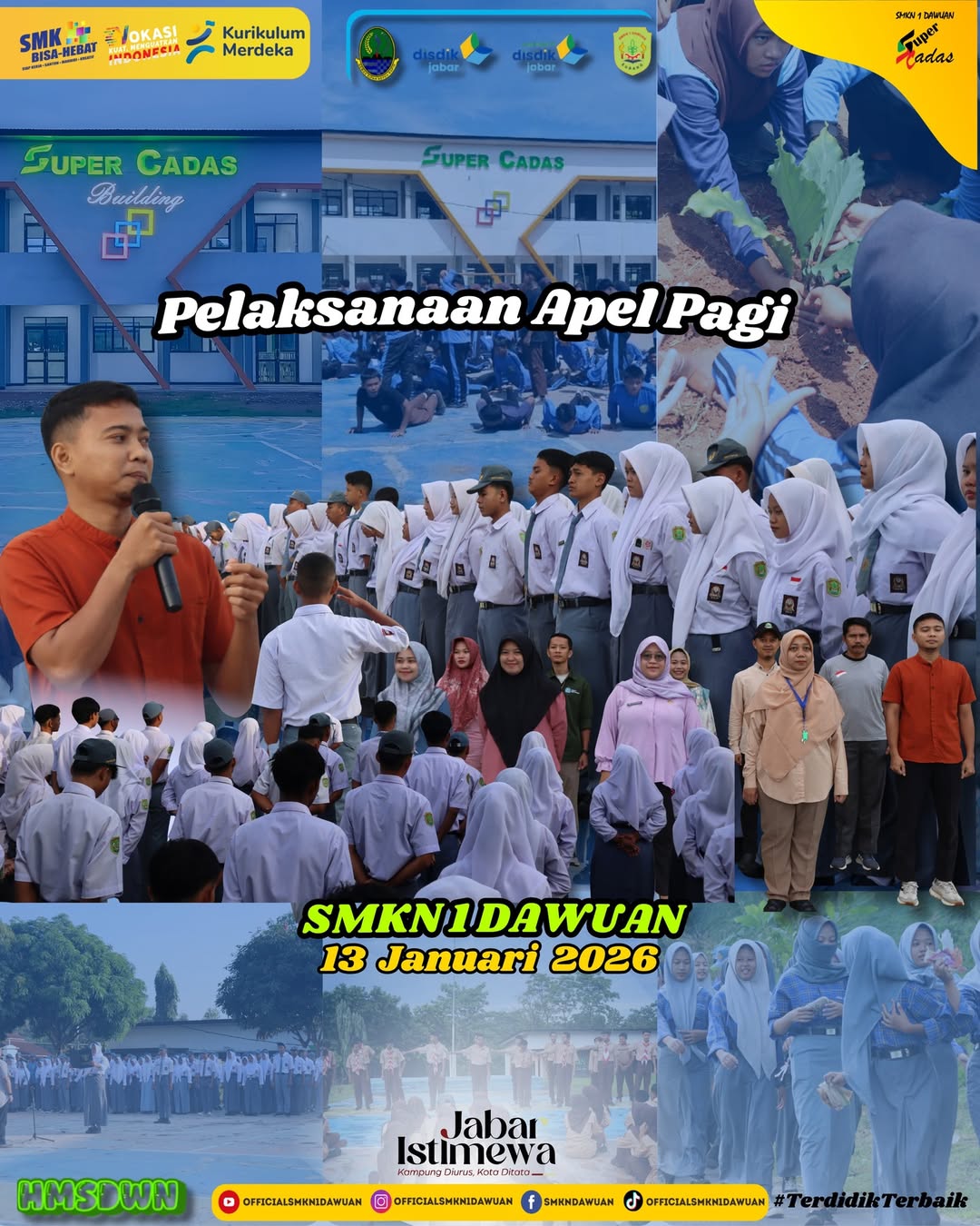Pelaksaan Apel Pagi dengan pembinda Bapak Jamalludin, S.T. dengan tema apel yang di bawakan nya tentang Apirmasi Fositif, Beliau menegaskan dalam amanat nya kepada seluruh murid SMKN 1 Dawuan untuk tetap bersikap fositif dalam melakukan hal hal yang akan di lakukan.