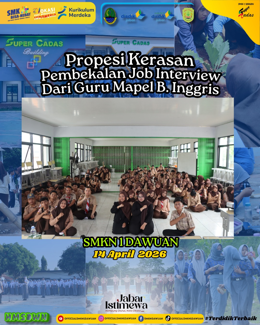 Dalam upaya meningkatkan kesiapan peserta didik menghadapi dunia kerja, SMKN 1 Dawuan melalui kegiatan PROPESI KERASAN menyelenggarakan pembekalan job interview yang dibimbing langsung oleh Guru Mata Pelajaran Bahasa Inggris. Kegiatan ini bertujuan untuk melatih kemampuan komunikasi siswa, khususnya dalam menghadapi wawancara kerja yang menggunakan Bahasa Inggris.