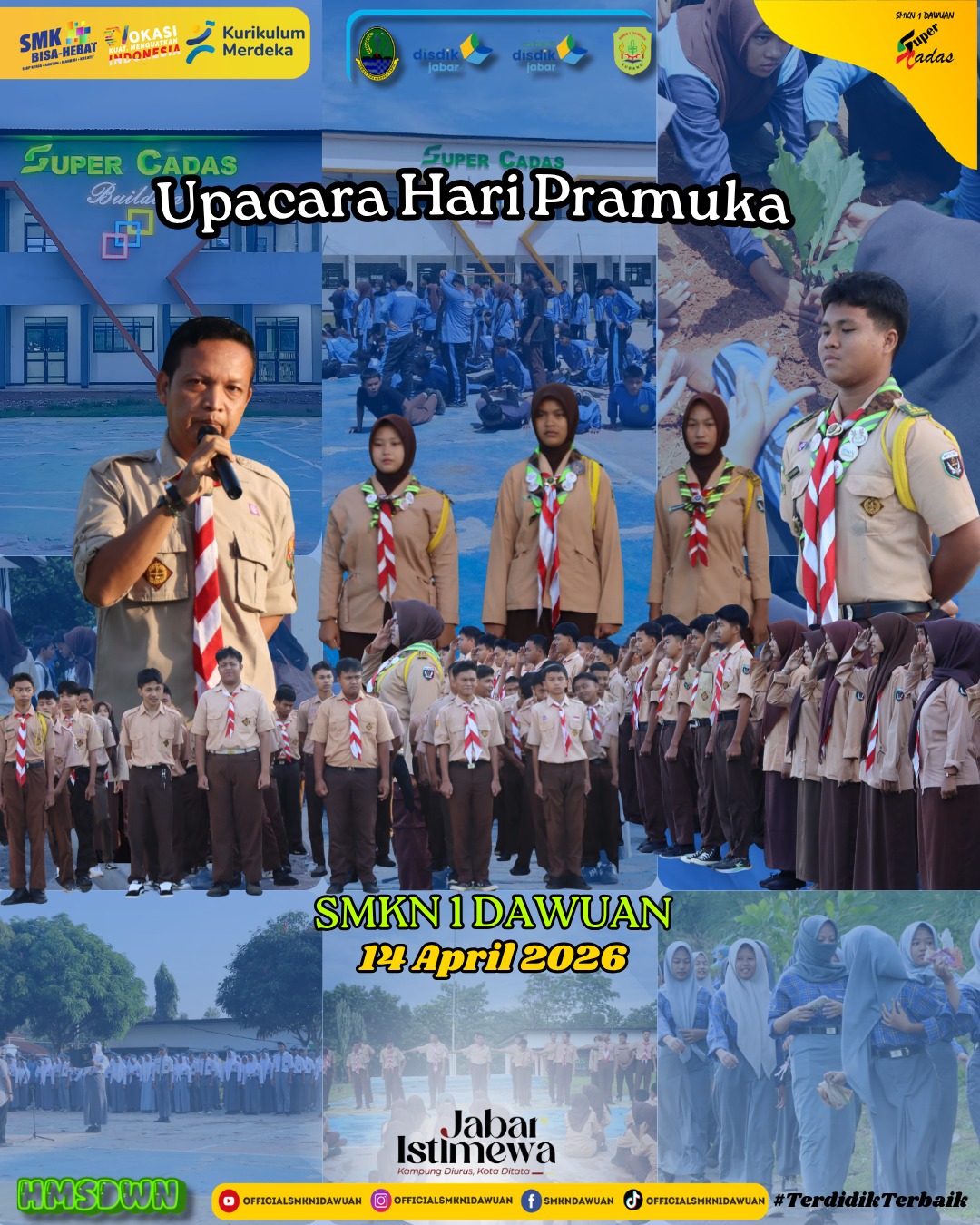 Kegiatan Upacara Pramuka yang dilaksanakan pada tanggal 14 April 2026 di SMKN 1 Dawuan berlangsung dengan penuh khidmat dan semangat kebersamaan. Upacara ini menjadi salah satu sarana untuk menanamkan nilai kedisiplinan, tanggung jawab, serta jiwa kepemimpinan bagi seluruh peserta didik.
