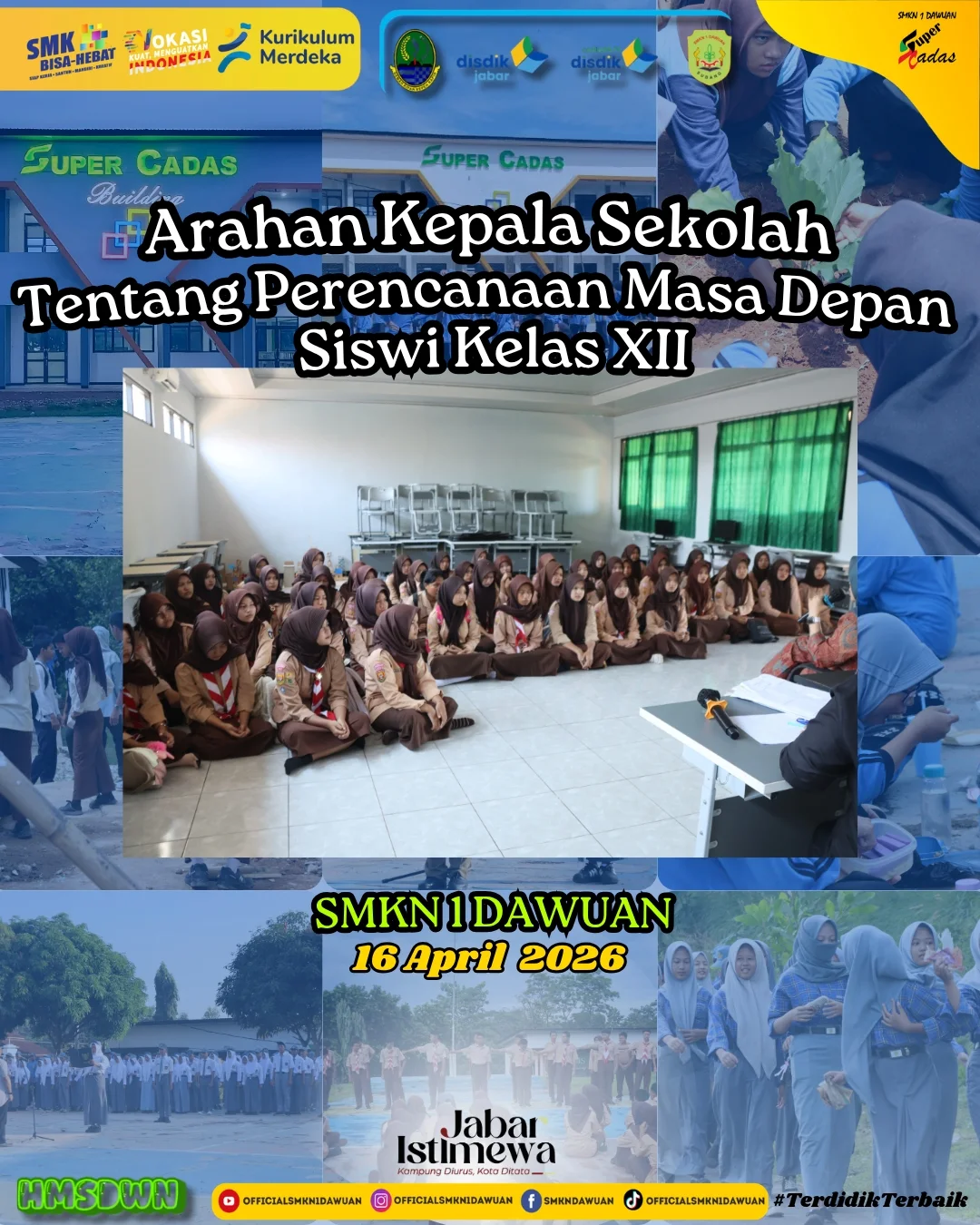 Langkah menuju masa depan dimulai dari perencanaan yang matang dan keyakinan dalam diri. Dalam kesempatan berharga ini, para siswi kelas XII SMKN 1 Dawuan mendapatkan arahan langsung dari Ibu Kepala Sekolah, Ibu Hj. R. Eris Garini, S.Pd., M.I.Kom., mengenai pentingnya mempersiapkan masa depan sejak dini.