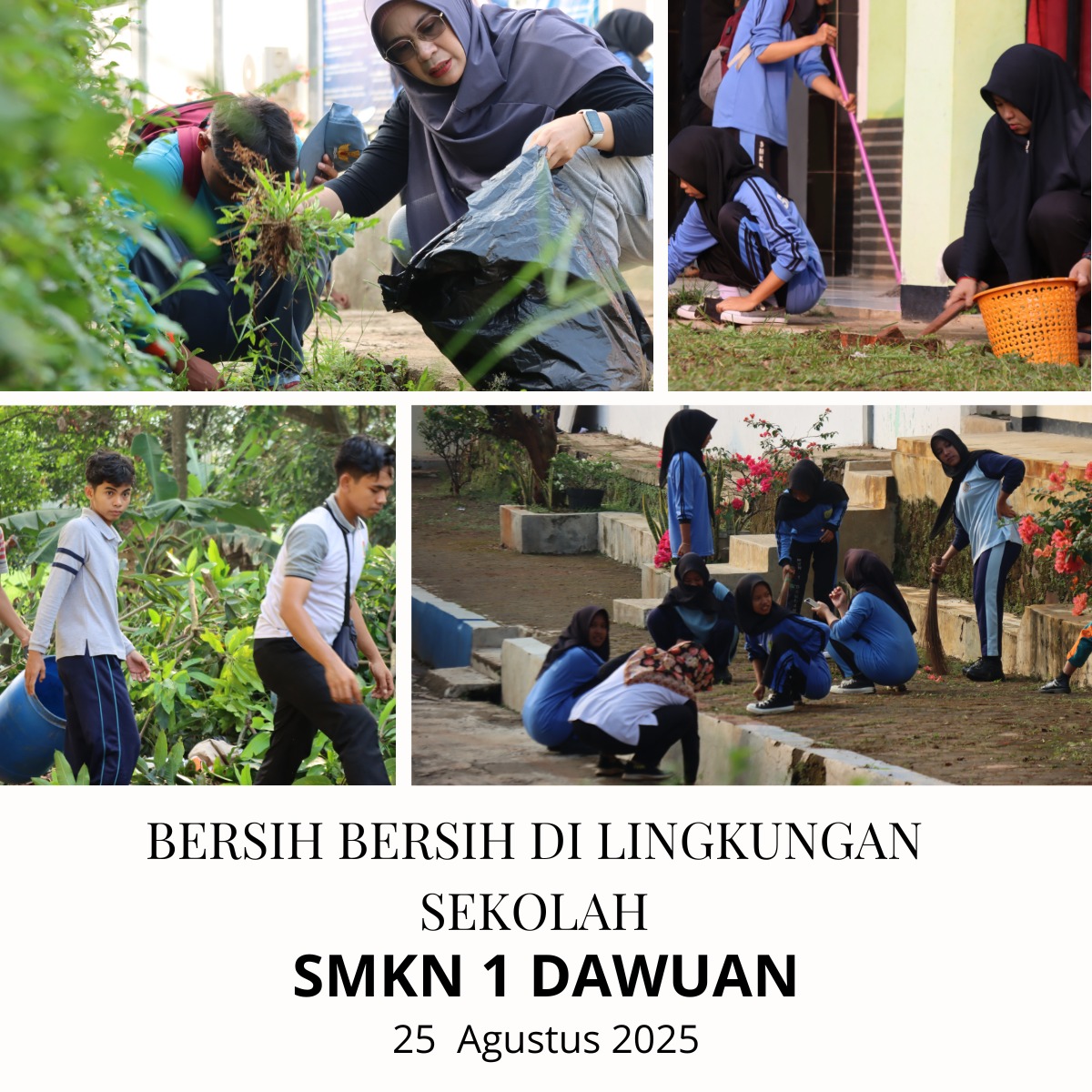 Subang,25 Agustus 2025, pada hari senin setelah melaksanakan apel, guru-guru dan murid SMKN 1 Dawuan melaksanakan kegiatan bersih-bersih di sekitar lingkungan sekolah.