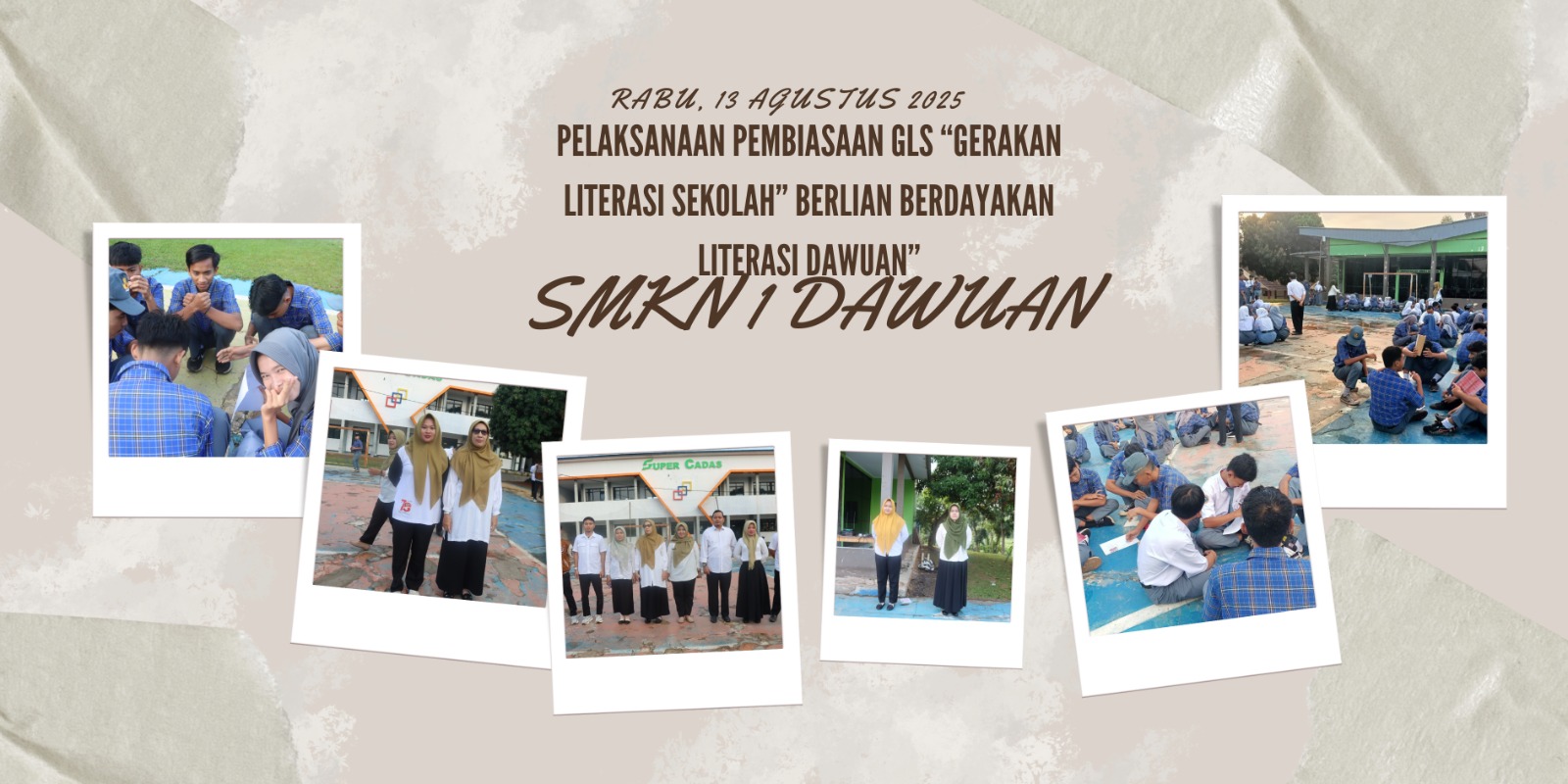 pada hari rabu tanggal 13 Agustus 2025, SMKN 1 DAWUAN melaksanakan kegiatan Gerakan Literasi Sekolah (GLS) yang diikuti oleh seluruh murid kelas X dan XI yang didampingi oleh wali kelasnya.